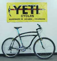I worked for Yeti from 1999 until 2001, and I purchased this bike from him in 1999. This is the only Yeti Cruiser to have a set up for derailleurs, since the original had an internal speed rear hub. It's set up with period components (Curve Titanium skewers, Curve Magnesium non-v brake cantilevers, Ringle stem, seat post and anti chain suck thing, Yeti Embroidered Saddle, Chris King headset, Yeti Accu-trak fork, Turquoise Yeti Grips).