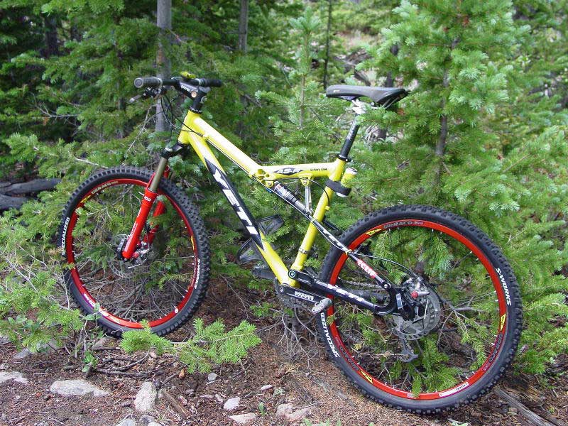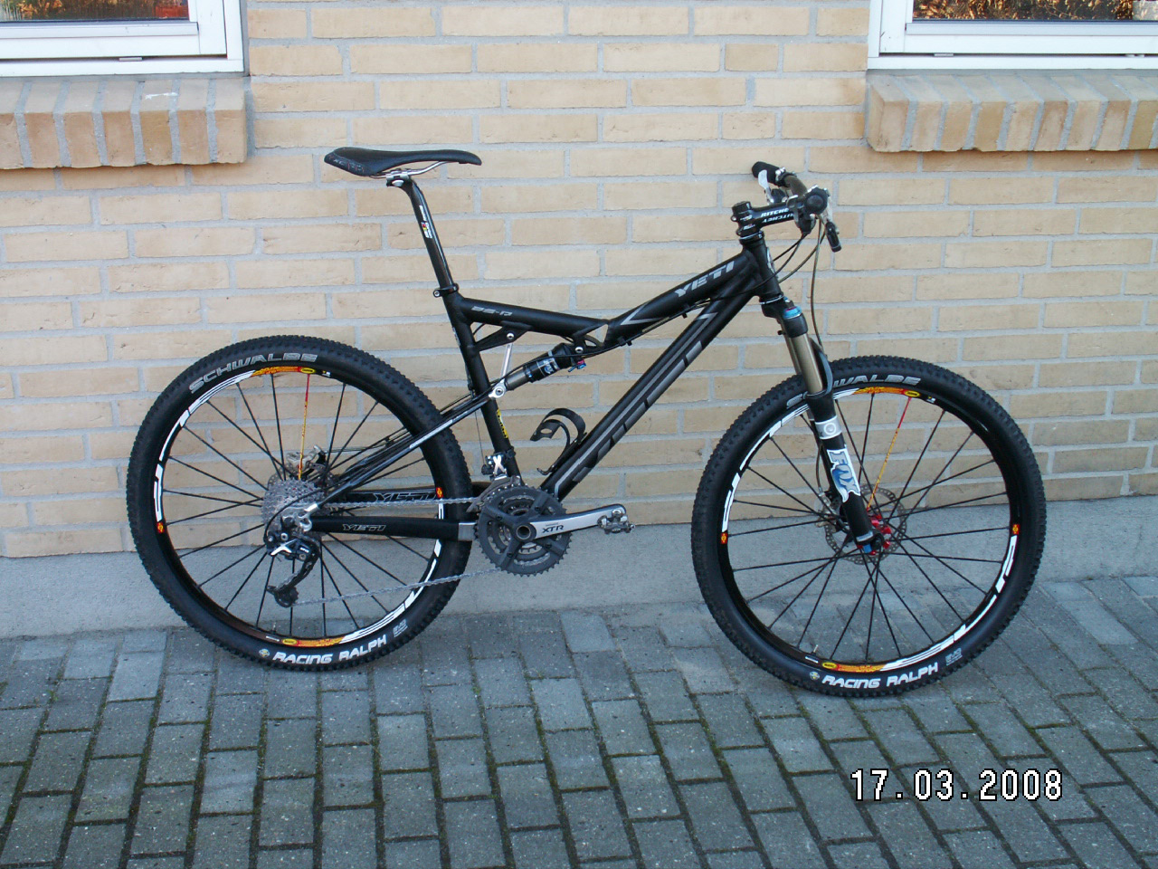 spec: frame: yeti ASR-SL 2007 M shock: fox rp23 fork: fox float 32 rlc 120mm headset: ChrisKing stem: Point 1 Racing 90mm ti bolts bar: easton EC70xc 685mm grips: turq yeti grips brakes: Hope Mono mini/M4 full ti bolts + Braking rotors seatpost: Easton EC70 Tu bolts saddle : Italia Teknologika 120gr chainset: shimano xtr 9 speed triple pedals: CB EB Ti axle shifters: shimano XTR rear mech: shimano xtr 9 speed front mech: shimano xtr triple cassette: sram PG980 11.32 wheels: Mavic 717d + sapim cxray black/withe + CK hub (bolt on rear + iso 15mm front) tyres: schwalbe nn or Conti race king