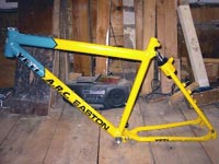 But since we made so few C-26's, which I'm found of because it was Easton's first, I'll go with the ARC. The tube set that I designed for the ARC push the weight limits of all bikes being built at that time. I can say with complete confidence that the ARC was the first mountain bike to use butted (Taper wall) tubes throughout the frame. The tubes were all made from 7005-T6 aluminum that used a special age that was developed to maximize toughness when used in a welded structure. The top tube was 1.500 in diameter and used .050/.030/.050 wall thickness and was crimped into the classic Yeti flat oval shape. The down tube was round at 1.750 in diameter and used .085/.035/.050 walls. This was the thickest walled down tube made at the time, but because it was only .035 in the center section it still was very light. Frames often broke at the head tube weld, gusseted or not so I wanted to solve that problem. The seat tube was 1.250 and was .098/.040/.060. The chain and seat stay loop was a cool piece of work and often goes unnoticed for what it was. The outer diameter was gradually swaged down from .875 to .750 between the front chain rings and the rear drop outs. We felt that using a constant diameter would either make the stay too heavy or too weak. We also new that the loop at the BB on the FRO's were a weak point so we eliminated that bend and cleared the tires and chain rings with an "S" bend. The internal walls also changed from .083 at the BB to .062 at the drop out and stayed thin to the seat cluster. The tubes were then sent to Yeti's bend to create the classic loop. Julie raced and trained on a single ARC and won everything in sight with out a failure, and I'm particularly proud of that.