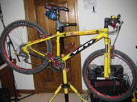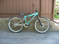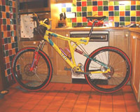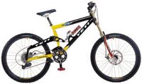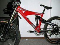 Lawwill DH-9 2001-2004- From Push shock, to Pull shock,and back, the last and best version on the Lawwill design came with a tube main frame in 2001, and a Sweet Monocoque front triangle after that, now with 9" of travell, but you already knew that, early versions still had the 12mm axle, and Hayes brake mount, Later Lawwills had 15 or 20mm axles, with the later being a Razor Rock hotrod kit (drop links and hub), these featured Hayes or IS brake mounts, but IS was more popular opening up the Lawwill design to brakes fron Hope, Shimano and many others. The brochure picture in the 02-04 catalogues featured Custom team decals, these were never available, but were fitted to Nathan Rennie's Lawwill.
